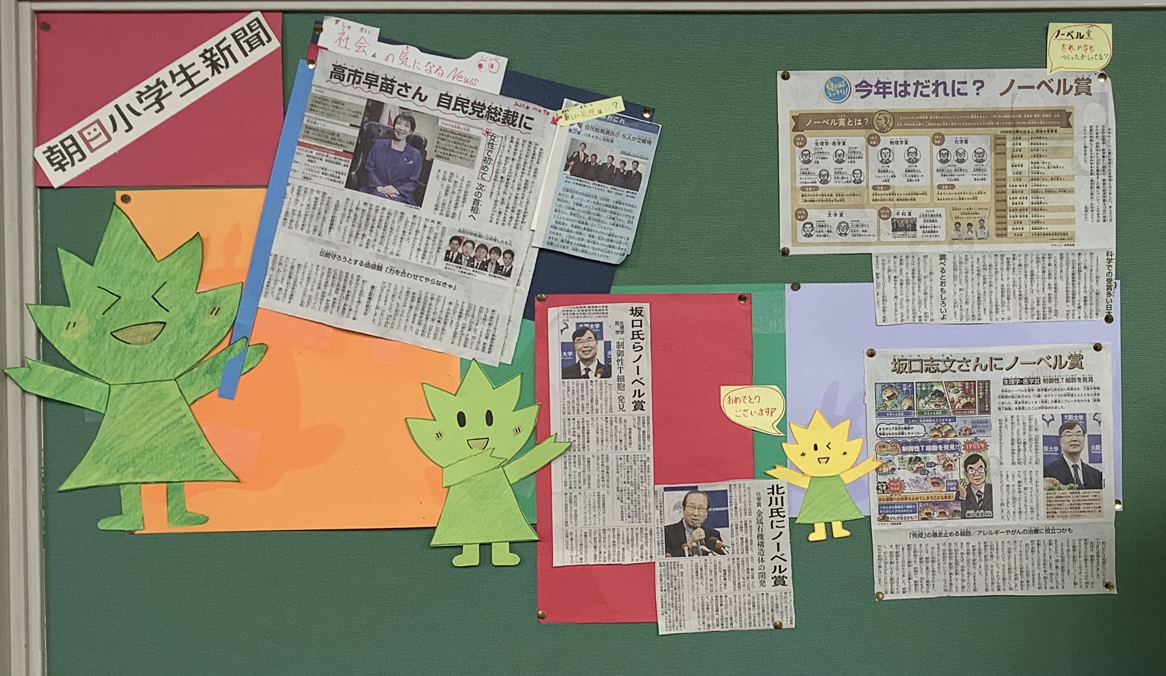政権与党の新しい総裁の誕生や、日本人科学者によるノーベル賞受賞など、社会の動きが大きなニュースとなっています。図書室では、こうした時事問題を子どもたちが身近に感じられるよう、関連する掲示を行っています。今回は、ノーベル賞に関連するニュースにあわせて、ノーベル賞にまつわる書籍も紹介しています。図書室は、読書の場であると同時に、情報発信基地としての役割も担っており、子どもたちが社会の出来事に関心をもち、考えるきっかけを提供しています。特に高学年の子どもたちには、図書室の掲示や紹介を通して、時事問題に触れ、自分の考えを深めていく力を育んでほしいと願っています。図書室から広がる学びが、子どもたちの視野を広げ、未来への一歩につながることを期待しています。