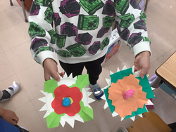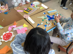 4月に入学する新1年生に向けて、お祝いの飾り作りを行いました。新1年生に気持ちを込めて、一人ひとり好きな形のお花を作り、学級全体で一つの花束を作りました。入学当初よりもハサミの使い方が上手になっていて、成長を感じました。