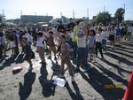 秋晴れの下、全校集会を校庭で行いました。集会委員会5・6年生が中心となって企画したメディシングボールでした。各クラス一列で並び、「用意、スタート。」