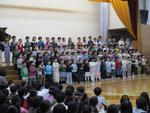 1年生がミニミニコンサートで、歌「フルーツケーキ」を発表しました。司会の堂々とした挨拶から発表が始まり、練習の成果を発揮して手拍子や振り付けを取り入れて歌い上げました。「リンゴ」「リンゴ」「バナナ」「バナナ」…見所のフルーツの名前の掛け合いもばっちり決まりました。