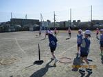 4年生が体育でTベースボールに取り組んでいます。野球に似ていますがピッチャーはおらず固定されたポールの上にボールをのせ攻撃チームのバッターが打つところから始まります。守備チームはボールが飛んできそうな場所で守り、ボールを取った人だけではなくチームの全員がきめられたサイクルの中に座るとアウトがとれます。「がんばれ。」「遠くまで打って。」と攻撃チーム。「ボールをとったらすぐに走って座ろう。」と守りチーム。寒さに負けず元気な声が校庭に響いています。