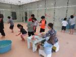 準備した容器に水を入れ、空のペットボトルに水を当てて倒す子たち、水を遠くまで飛ばして飛距離を競う子たち、袋に爪楊枝で穴をあけてシャワーを楽しむ子たち・・・運動場に水でお絵描きをするのも楽しそうでした。水を噴き上げて噴水のようにして盛り上がる姿もありました。おもしろい遊びの情報交換をしながら、遊びが広がっていき、どのクラスでも大満足の様子でした。