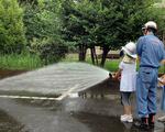 夏休み前に、社会科の学習で、消防団や篠原出張所の消防士の方々と一緒に、放水体験や消火栓・消防の機材の見学をしましました。