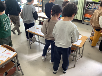 国語の「ものの名まえ」の学習で、物には、一つ一つに名前がついていること。そして、一つ一つの物をまとめてつけた名前(くだもの・さかななど)があることを確認しました。クラスごとに何のお店を開くか話し合い、物の名前を集めてお店屋さんごっこをしました。