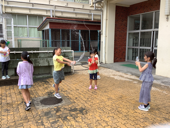 準備した容器に水を入れ、空のペットボトルに水を当てて倒す子たち、水を遠くまで飛ばして飛距離を競う子たち、袋に爪楊枝で穴をあけてシャワーを楽しむ子たち・・・運動場に水でお絵描きをするのも楽しそうでした。水を噴き上げて噴水のようにして盛り上がる姿もありました。おもしろい遊びの情報交換をしながら、遊びが広がっていき、どのクラスでも大満足の様子でした。