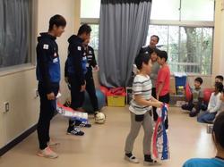 本来は、校庭でサッカーを教えていただく予定でしたが、雨天だったため、また、体育館が改修工事中で使用できなかったため、プレイルームでお話を聞かせていただくことになりました。