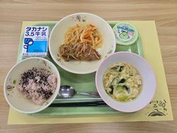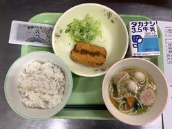 25日(火)の献立は、麦ごはん・牛乳・マグロカツ・ボイルドキャベツ・つるりんめん・やきのりでした。「つるりんめん」は、給食委員会の児童が考えた料理です。みんなが「つるっ」と食べられるよう醤油ラーメンをベースに、マスコットキャラクターの「つるりん」の顔をうずらのた卵で、とさかをカニかまで表現しています。やきのりの袋には、給食委員会の児童が描いたオリジナルのイラストが印刷されています。はじめてのメニューをみんなワクワクしながら、味わって食べていました。お椀の中に「祝」と描かれたなるとを見つけ大喜びしている児童もいました。