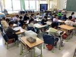 各クラスで、小学校生活初めての書き初めを行いました。これまで学習してきた、「とめ・はね・はらい・おれ・まがり」に気をつけながら、フェルトペンで紙いっぱいに「お日さま」と書きました。鉛筆とは違い、消しゴムで消すことができないので、いつもより緊張しながら、一生懸命書いていました。冬休みにも練習してきたので、しっかりとした字を書くことができました。