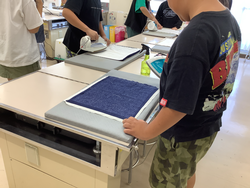 5年生では、ミシン縫いを中心として、生活を豊かにするためのランチョンマットを製作しています。子どもたちは、どのようにすればきれいに縫うことができるのかを試行錯誤して、改善を続けているところです。「なぜまっすぐに縫えないのか」「(おさえの)隙間を見ることが難しい」といった問題意識を解決できるよう、粘り強く取り組んでいる姿を見ることができました。作品がどのように完成するのか、楽しみです。