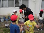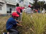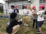 横浜の米農家、小川名さんからいただいて5月に植えた稲の苗はすくすくと成長し、今日稲刈りの日を迎えました。お米の栽培にも携わっていらっしゃる、レゲエアーティストのCORN HEADさん、平野さんにこつを教えてもらいながら、「本物のお米だね、すごい。」「たくさんできているね。」と子どもたちは嬉しそうに収穫をしていました。
