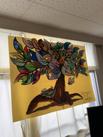 今回のために描いてくださった葉のイラストに、子どもたちは好きな色を塗ったり、想像の世界を描いたりして思い思いの葉を作りました。JUNK-Rさんがその場で描いてくださった幹のイラストに貼り付けると、個性豊かな5年3組の木が完成しました。
