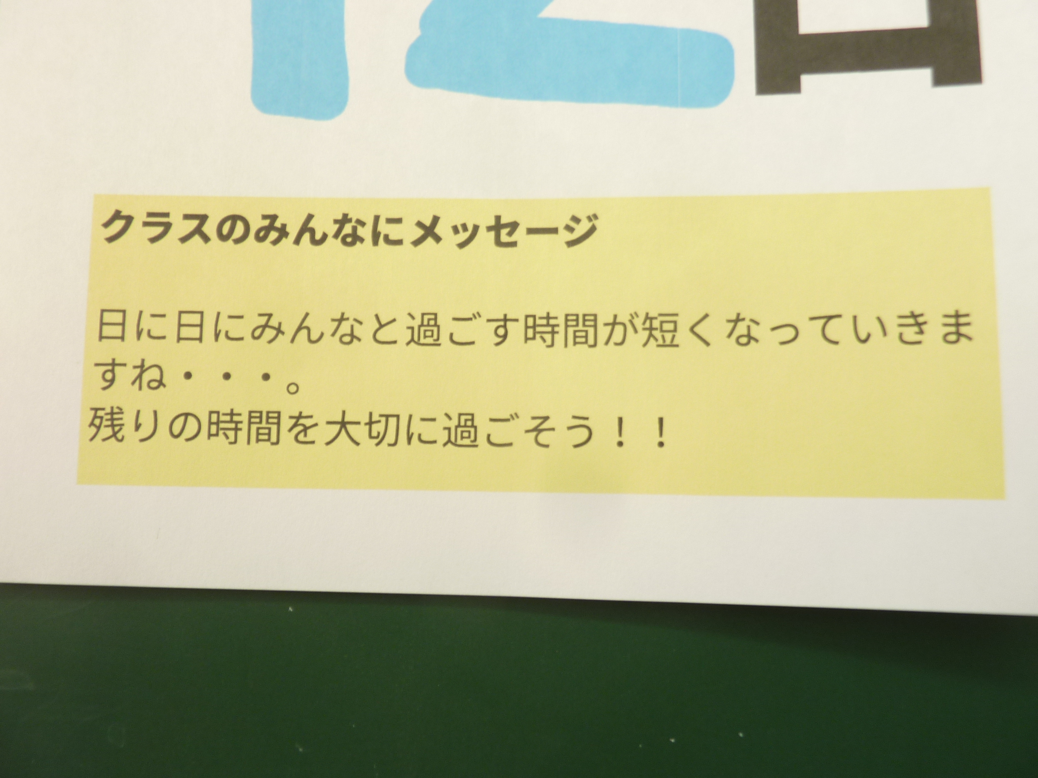 ▲1月となり卒業までの日めくりカレンダーをクラス毎に作りました。この日(1/16)は、卒業まであと42日のカウントダウンとなりました。クラスのみんなへのメッセージには、上記のようなメッセージが綴られていました。二度と来ない小学校生活、一日一日を大切にしていきましょう。