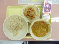 メニューは、今も昔も大人気のカレーライスです。今年度の給食は、188回ありました。給食調理員さんの作る愛情たっぷりの給食でみんな大きくなりました。調理員さん、いつも美味しい給食ありがとうございました。