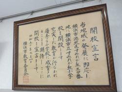 ▲校長室には、今も「開校宣言」が掲げられています。これを見ると、当時は、横浜市港北区すみれが丘だったことが分かります。
