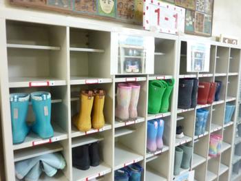 雨の朝となりました。下駄箱には色とりどりの長靴が並んでいました。