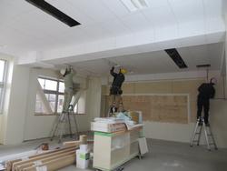 ↑12月初めの様子です。壁面にはベニヤ板が貼られていて、新築の家のようなすがすがしい木の香りがしていました。天井もすっかり覆われて、ちょうど照明器具を取り付ける作業をされていました。照明器具は、これまで使っていたものを再利用します。