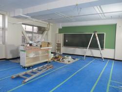 ↑12月中旬、外の足場が撤去される直前の様子です。エアコンや黒板、ロッカーや清掃用具入れが設置されて、もうすっかり教室の雰囲気です。壁の塗装や掲示板のクロス貼りも終わり、ブルーシートの下には長尺シートの白い床も見えました。