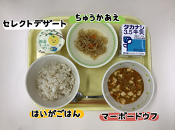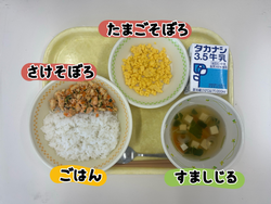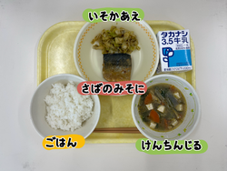 ★この日の献立は、主食がごはん、主菜がさばのみそ煮、副菜が磯香あえとけんちん汁でした。