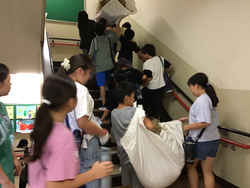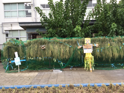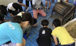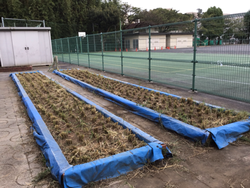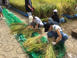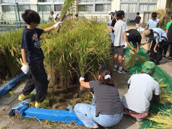 稲がすくすくと成長しました。夏休み明け、カラスやスズメが来ていたので、鴨居原市民の森の方とネットを被せ、対策グッズも作りました。お陰でたくさん食べられることなく、収穫の時期を迎えることができました。収穫は、鎌の扱いに緊張していましたが、怪我なく進めることができました。その後、稲を干し、脱穀も行いました。みんなで協力して大事に育てたお米。果たして何kgなのか楽しみです。