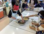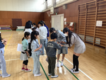 野島宿泊体験学習のバスレクで盛り上がった風船テープはがしのゲームをしたり、収穫したサツマイモを使っておにぎりを作って食べたりしました。また、前日に作ったサツマイモケーキをプレゼントしてお礼の気持ちを伝え、楽しい時間を過ごすことができました。