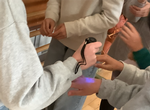 さらに、手洗いスタンプの活動も行いました。ブラックライトで光るインクのスタンプを手に押し、手洗い後にどこまできれいに洗えたかをチェックします。