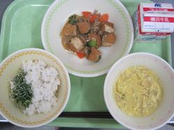 麦ごはん 牛乳 生揚げと豚肉のみそ炒め かきたま汁 ふりかけ |
