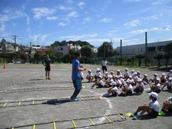 汗ばむほどの晴天に恵まれ、DeNAランニングクラブから2人のコーチを招いてランニング教室を行いました。足じゃんけんから始まり、足の上げ方、腕の振り方など基本からしっかり教えていただきました。
