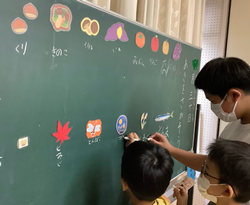 日本で生まれ育ち、日本の秋に慣れ親しんでいる児童もいれば、出身国に「秋」がなく、日本の秋が初めての児童もいます。国際教室では、「①本物の松やどんぐり、いちょうに触れる。②秋探しをして、秋の言葉を知る。③秋の俳句作りをする。」等、各学年の教科書に合わせた学習をしています。秋探しでは、異学年交流を行い、「魚(秋刀魚)ある!」とお互い見つけたものを見合い、楽しく過ごしていました。