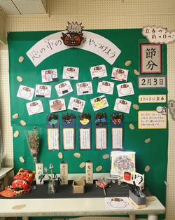 国際教室では、日本の伝統行事『節分』について学び、‶心の中の悪い気持ちを追い出す”という意味を知りました。自分の中の〝やっつけたい鬼”を絵に描き、豆まきごっこも行いました。文化を楽しみながら学ぶ、よい機会となりました。