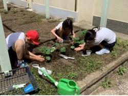実行委員を中心に草抜きをして、土を耕す作業を行いました。植えた後に、「どっちがヒョウタンで、どっちがツルレイシだろう」と、子どもたちは興味津々な様子でした。