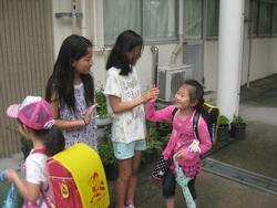 全校のみんなに元気になってもらいたい、元気なあいさつが響く学校にしたいとの思いから、運営委員会が朝のあいさつ運動を行っています。今年は、国際理解や外国語活動で教わった英語やマレーシア語も交え、ハイタッチもしながら元気にあいさつをしています。
