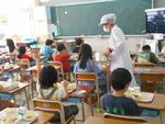 9月17日(金)本日の給食の献立は、麦ごはん、牛乳、肉そぼろ、磯香あえ、月見汁です。月見汁の中には、お月見にちなんで白玉が入っています。感染対策を考えて、給食のおかわりは担任の先生が直接まわって配膳しています。
