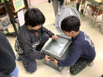 3,4校時の地域防災拠点訓練では、3年生は災害用トイレ・水消火器の使い方と個別級は新聞紙スリッパ作りをしました。