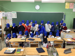 キャップをもらった子どもたちは、さっそく教室の中でかぶってベイスターズの応援歌を歌っていました。