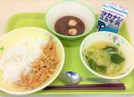 ごはん、牛乳、ツナそぼろ、みそ汁、白玉ぜんざい