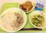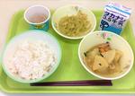 麦ごはん、牛乳、豚肉とだいこんの煮物、ごまじょうゆあえ、納豆