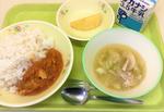 麦ごはん、牛乳、チキンライスの具、野菜スープ、りんご