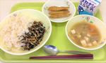はいがごはん、牛乳、ひじきごはんの具、きびなごフライ、けんちん汁