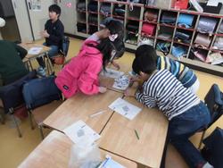 5組では、宿泊体験に向けグループごとに係活動を進めています。式担当やレク担当など分かれて話し合っています。