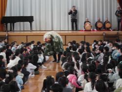 冬休み明け、毎年恒例の獅子舞を、地域で活動されている笠はや志保存会の方に来ていただき、披露していただきました。子ども達はとてもうれしそうに獅子舞やおかめやひょっとこの踊りを鑑賞しました。その後、3年生はお囃子体験をしました。獅子舞や小太鼓などを実際触らせていただき、貴重な体験となりました。