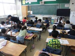 4年生が体育館でキャンプファイヤーの練習をしていました。先生のギターに合わせて「遠い山に日が落ちて」を合唱していました。5年算数では、小数のわり算にチャレンジしていました。小数点の位置に気を付けて計算していました。2年算数「長さ」では、竹ものさしでの長さの測り方を練習していました。1年図画工作「やぶいたかたち みつけたよ」では、画用紙をちぎりながら、できた形をいろいろなものに見立てていました。