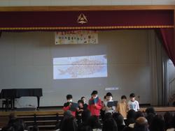 体育館ステージで合奏や合唱、朗読などの発表、教室でスピーチ、図工の作品作り、生活科や総合的な学習の時間の取り組みなど、各学年で普段の学習活動や1年間の成長の様子を保護者の方に見ていただきました。