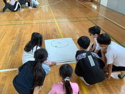 体育館の床に貼られた紙の上で、ペットボトルのキャップを指ではじいて勝敗を決めます。