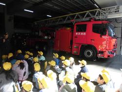 消防署ではポンプ車やはしご車、救急車などを見学し、消火器の体験もできました。