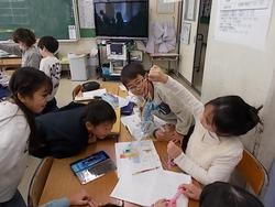 吉田新田の学習を進めている4年生が学習で出た課題について聞くことができるように、歴史博物館の方が出前授業に来てくれました。10キロの砂袋を2人で持ち上げて運んだ経験もさせてもらっていました。