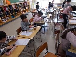 1年生が図書の時間に読書記録を書いていました。図書の時間は国語の時間の中で計画的に行い、読書の習慣を身に付けられるように取り組んでいます。長く読むことができなかった子も少しずつ慣れてきて、文字がある本に向かうことができるようになってきました。