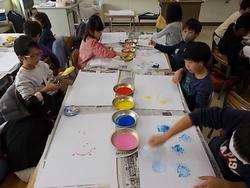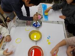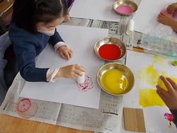 プリンのカップやトイレットペーパーの芯、スポンジ、折った段ボール、ポチポチのある緩衝材などにインクをつけてスタンプのように画用紙に押して形をつけていきます。写してできる形を見つけ、工夫して表すことを楽しんでいました。できた形や色から想像を広げ、表したいことを考えていきます。
