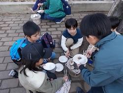 2月14日におやじの会の冬イベントがおこなわれました。夏のおばけやしきに対して、冬のメインイベントは餅つきです。おやじの会のみなさんが前日から準備していました。餅つきでできた餅を家庭科室で食べやすい大きさに丸めていました。おやじの会、PTA、子どもたちがかわるがわるお手伝いをしていました。