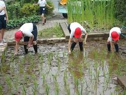五年生が田植えを行いました。地域の農家の岡本様に今年もご指導いただきながら、全員が数株ずつ苗を田んぼに植えました。生まれて初めて田植えの体験をした児童が多く、貴重な体験となったようでした。田んぼの中に足を踏み入れた感触に、始めはとまどっていましたが、決められた場所に苗を植え終わると「気持ちよかった。」と田んぼの土の感触を楽しんでいました。