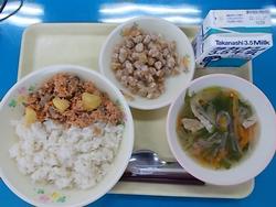 本日の給食のメニューは「はいがごはん、あきあじごはんのぐ、さわにわん、あげだいず、牛乳」でした。